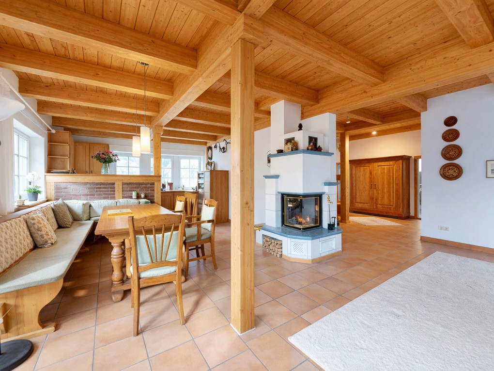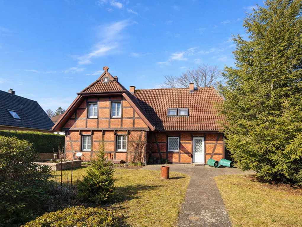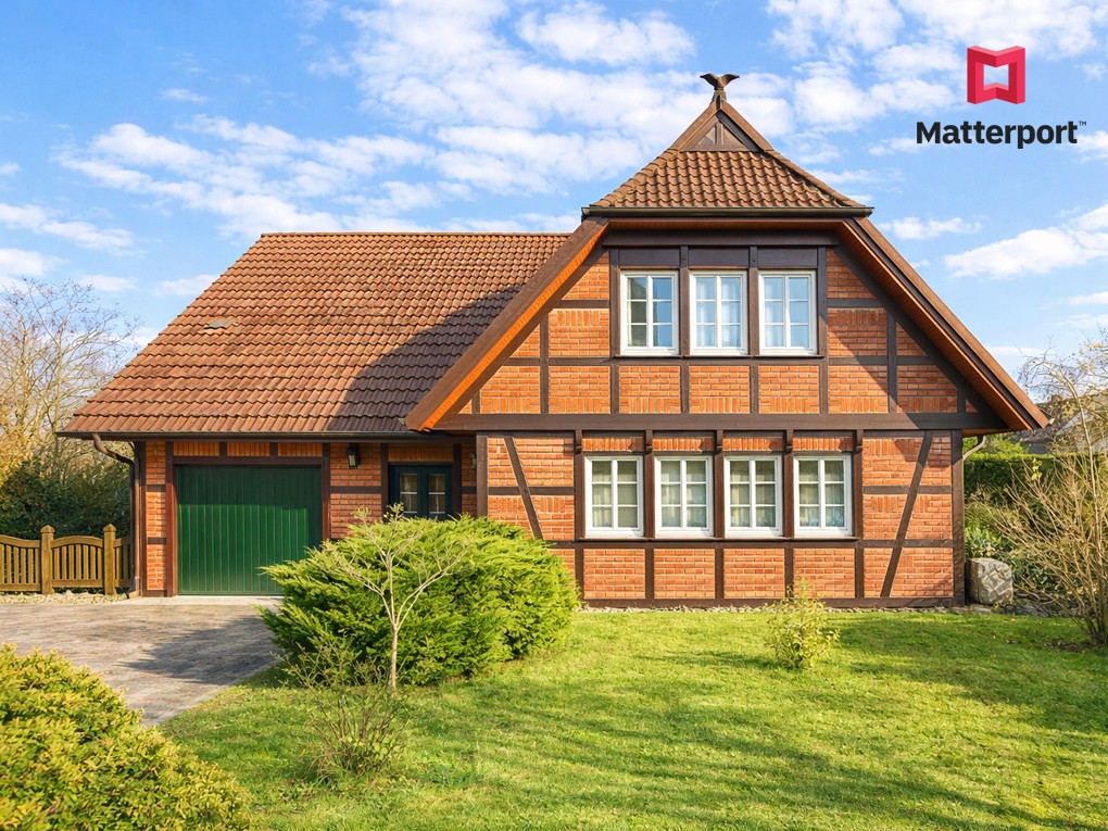 Traditionelle Handwerkskunst trifft auf norddeutschen Charakter. Dieses Fachwerkhaus der Zimmerei Ordemann beeindruckt vom ersten Moment. Die markante Dreigiebelarchitektur mit den klassischen Niedersachsen-Pferdeköpfen und die warme Kombination aus Klinker und sichtbarem Holzwerk erzählen von solider Baukunst und gelebter Tradition. Im durchgehend gefliesten Erdgeschoss empfängt eine großzügige Diele. Der offene Wohn- und Essbereich besticht durch seinen gemütlichen Kamin und die sichtbaren Holzbalken an der Decke, die eine behagliche Atmosphäre schaffen. Eine Eckbank mit großem Esstisch bietet Platz für gesellige Familienabende und Feiern. Angrenzend erweitert die Westterrasse den Wohnbereich an warmen Tagen ins Freie. Funktional zeigt sich die Einbauküche, bei Herd und Geschirrspüler (defekt) eröffnet sich Potenzial für eine zeitgemäße Erneuerung. Zur Küche gehört ein angrenzender Hauswirtschaftsraum mit Waschbecken und Platz für die Waschmaschine. Ein Duschbad komplettiert diese Etage. Im Obergeschoss befinden sich dreieinhalb weitere Zimmer, darunter ein besonders großzügig geschnittener und lichtdurchfluteter Raum. Zwei der Zimmer verfügen über praktische Einbauschränke. Abgerundet wird das Raumangebot durch ein Dusch- und Wannenbad. Hochwertiger Schurwollteppich in warmem Beige kleidet die Räume. Alle Fenster sind Kunststoffisolierglasfenster mit dekorativen Sprossen und hochwertigen Messinggriffen, die den traditionellen Charakter des Hauses unterstreichen. Abschließbare Griffe im Erdgeschoss sorgen dabei für zusätzliche Sicherheit. Der Dachboden ist über eine Einschubtreppe erreichbar und ermöglicht zusätzlichen Stauraum. Beheizt wird das Haus über eine Gaszentralheizung mit Heizkörpern. Eine Junkers-Gastherme aus dem Jahr 2018 bereitet auch das Warmwasser. Das Haus eröffnet Raum für individuelle Gestaltung und Modernisierung nach eigenen Vorstellungen. Für einen ersten virtuellen Rundgang steht Ihnen unsere 3D-Tour zur Verfügung. Wir freuen uns, Ihnen das Objekt auch bei einer Besichtigung vor Ort näherbringen zu dürfen.